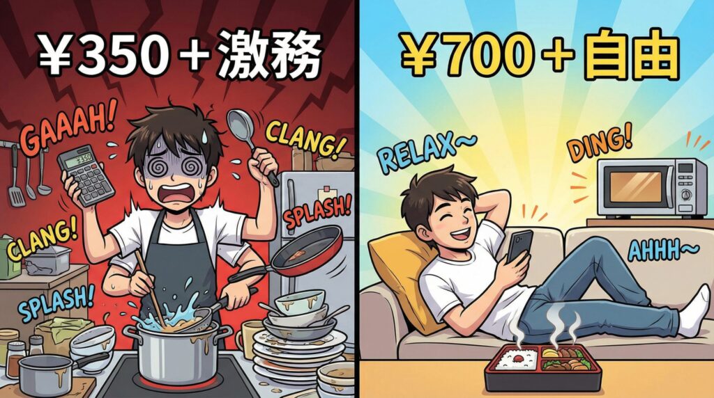 経理的に言うと、「不採算部門(平日の自炊)」を外部委託(アウトソーシング)して、経営を黒字化する戦略です。