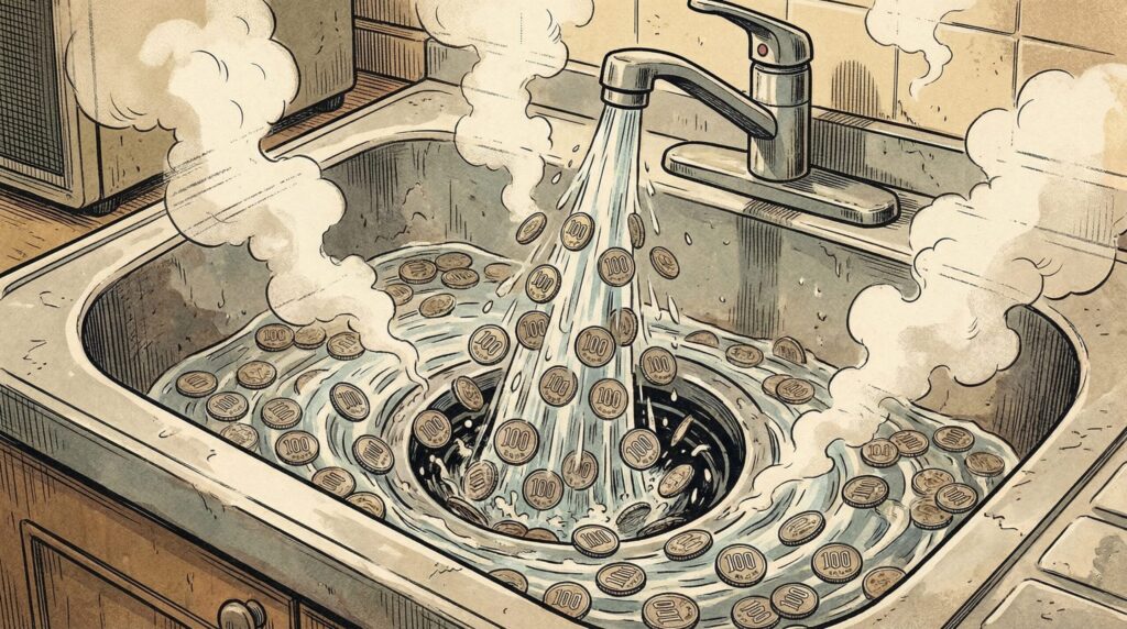 まさに、蛇口からお湯と一緒に「チャリンチャリン」と小銭が排水溝へ流れている状態です。