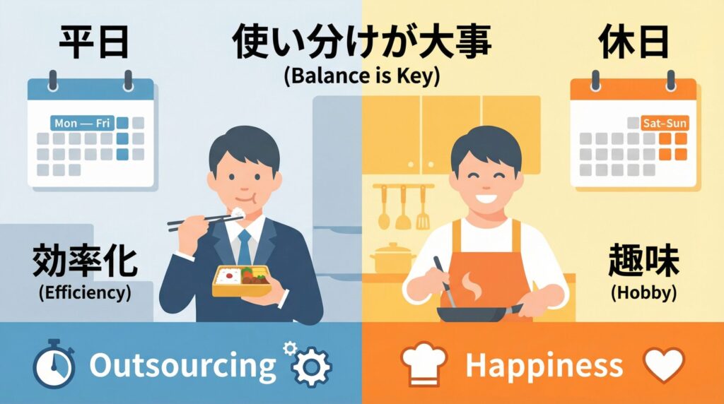 自炊を全否定する必要はありません。「労働(平日)」と「趣味(休日)」を使い分けるメリハリこそが、賢い一人暮らしのコツです。