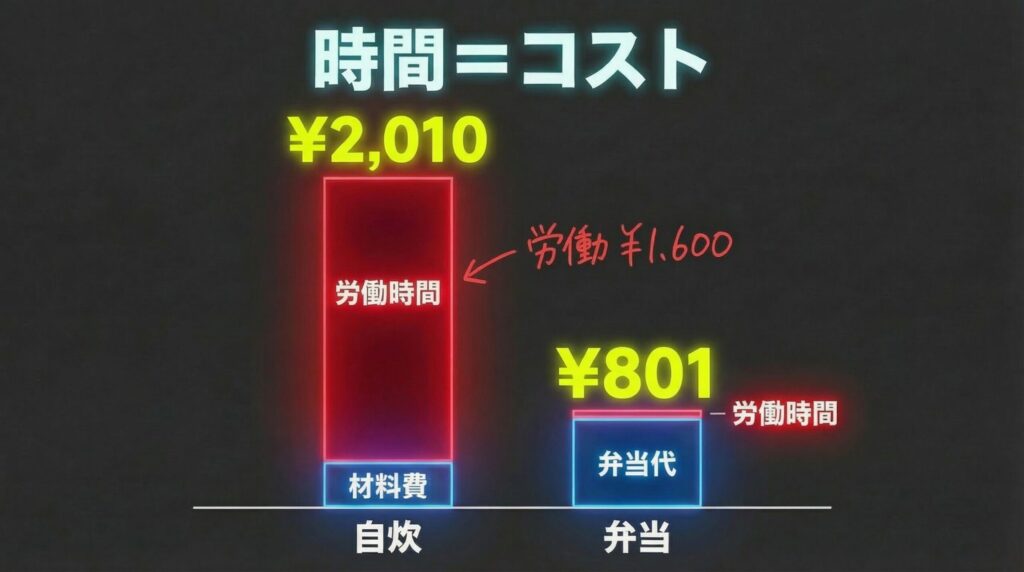 あなたは、たった300円の現金を節約するために、1,600円分の価値がある「自分の自由時間」を捨ててしまっている。 これが、一人暮らしの自炊が「赤字事業」であると断言する理由です。