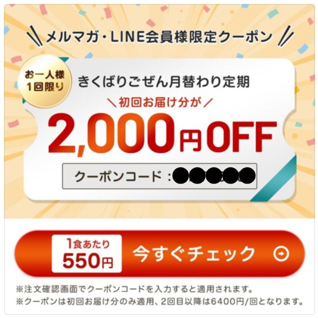 はじめて「きくばりごぜん」の定期コースを注文する人向けに配布されている1,200円OFFクーポンです。