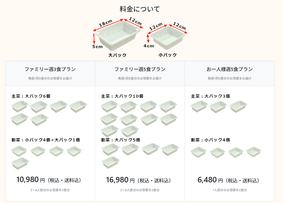 容器は大パック(18×12×5cm)と小パック(12×12×4cm)の2種類。プランごとのパック数は画像の通りで、冷蔵庫スペースの目安にもなります。