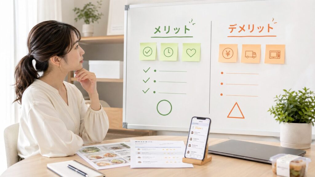 「自分の状況なら克服できそう」と感じた方は、手料理ストックが有力な選択肢になります。次のセクションでは、ここまでの口コミを踏まえてメリット・デメリットを整理しました。