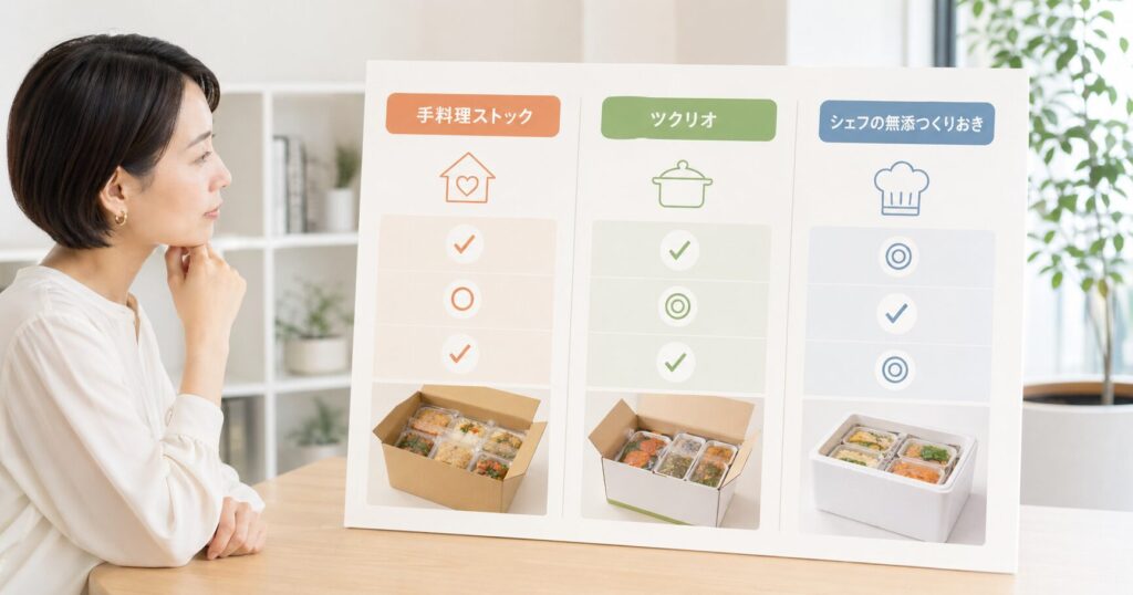 ツクリオ・シェフの無添つくりおきとの違いもあわせて解説しますので、「どれを頼めば後悔しないか」を決める材料にしてください。