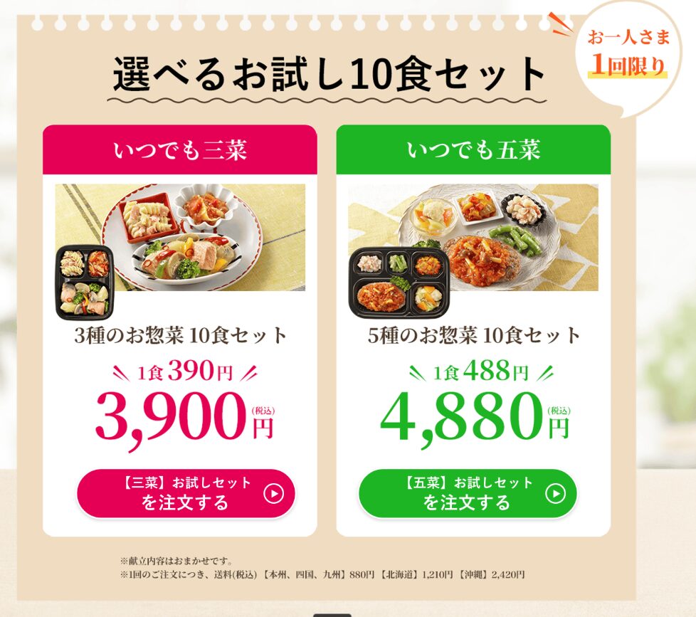 私も最初は、お試し割の「いつでも三菜」10食セットから始めました。