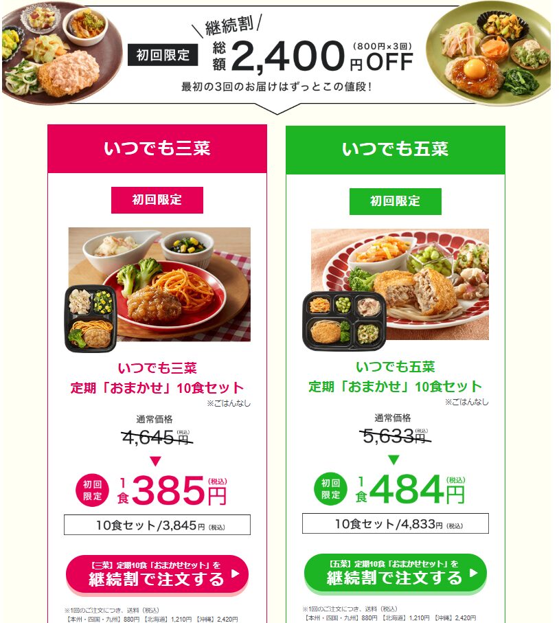 対象は「いつでも三菜」「いつでも五菜」の各10食セット。料金は次の通りです。