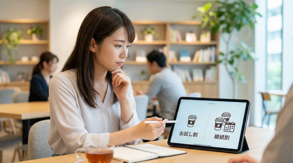 「まず試す」か「最初から続ける」かで選ぶ割引が変わるので、迷ったら当てはまる方を選べば大丈夫です。
