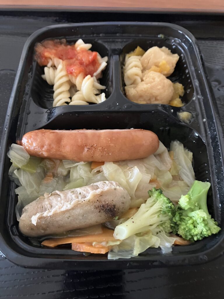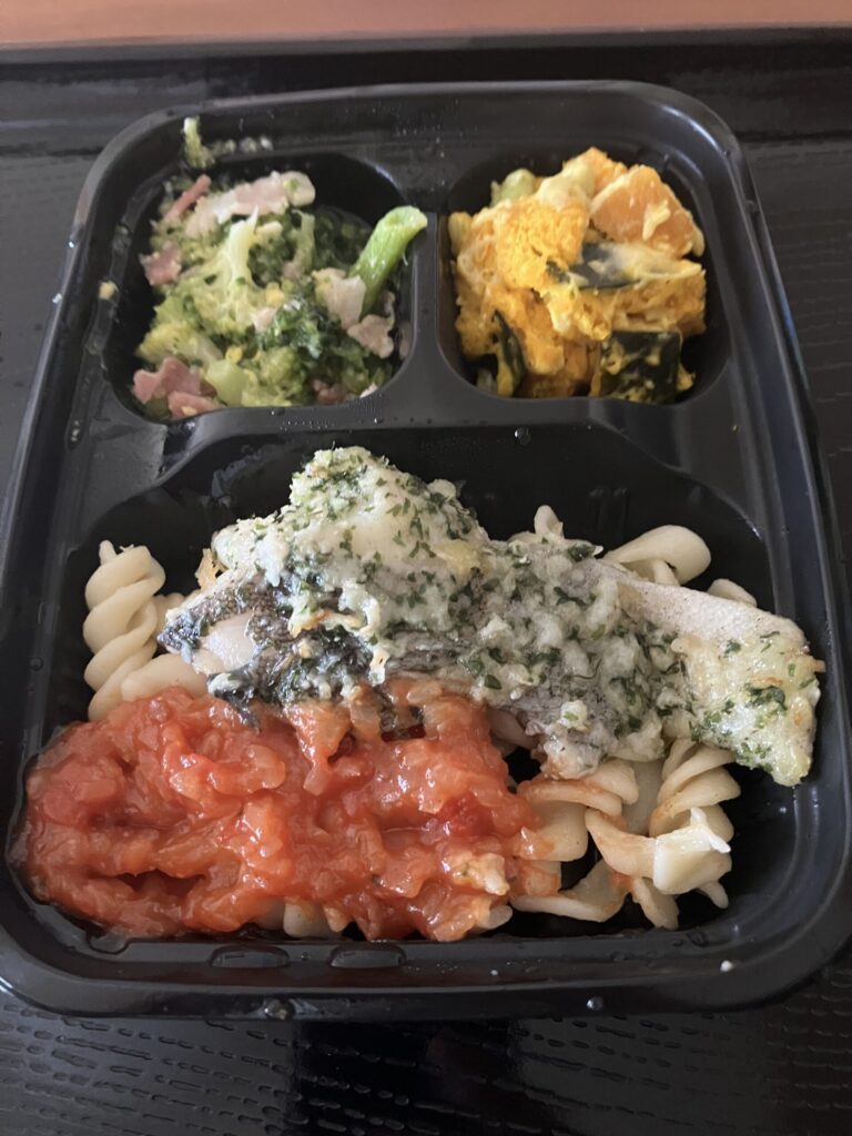 一方で、副菜のトマトパスタは少しフニャッとした食感で、味付けも薄めだったのが惜しいところ。