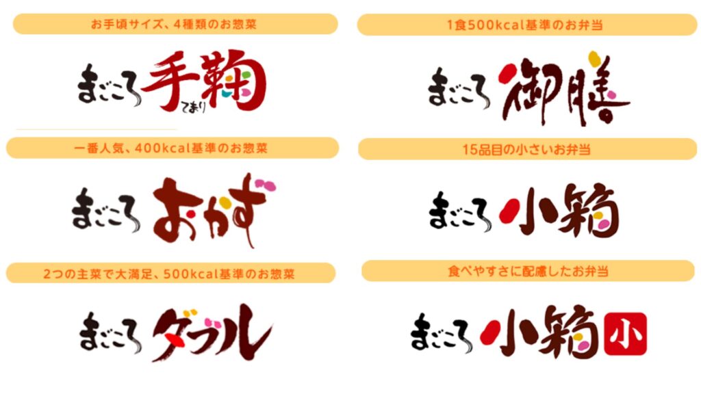 「まごころ御膳」「まごころダブル」「まごころ小箱」など、主菜・副菜がしっかり揃った和食中心のメニュー構成です。